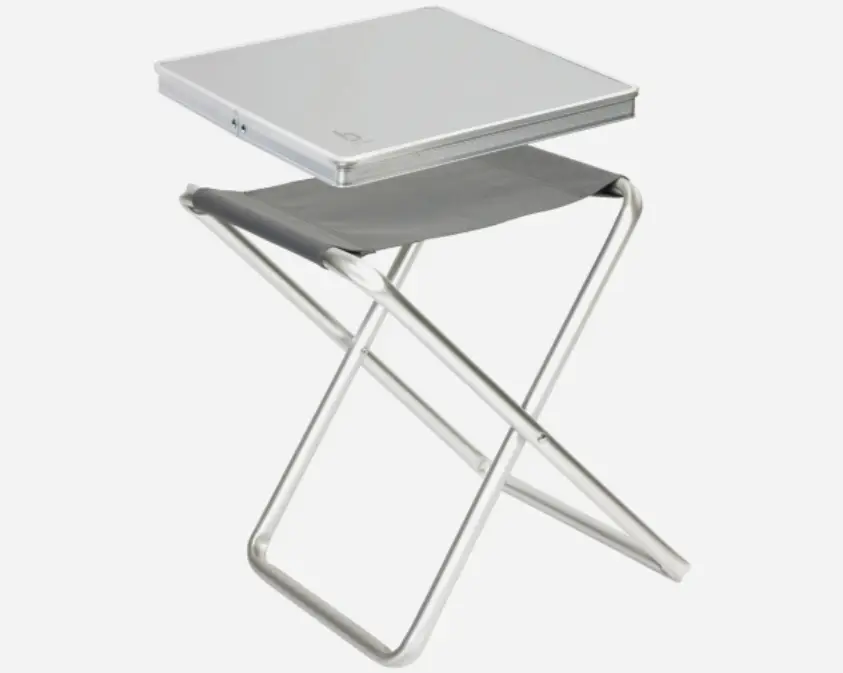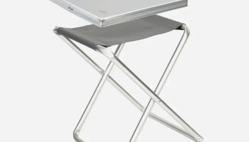 Een zeer stevig en stabiel krukje met handig oplegblad. Zo kan dit krukje worden gebruikt om te zitten, maar ook als bijzettafeltje. Dit krukje heeft een aluminium frame en een comfortabel 600D nylon zittingdekje. Het oplegblad is gemaakt van MDF met een stevige aluminium rand. Omgedraaid is dit oplegblad ook te gebruiken als dienblad. Zithoogte: 45 centimeter.