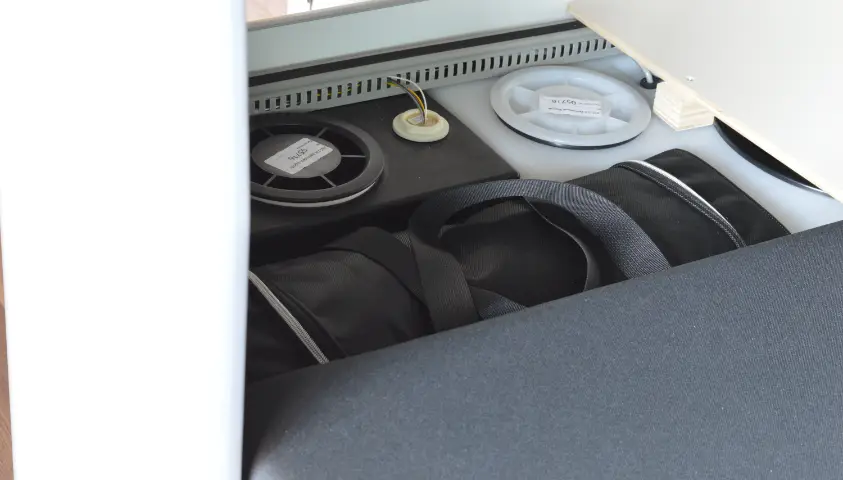 Originele carbags op maat gemaakt voor de Ford Nugget voor gebruik onder de de bank naast de water reservoirs